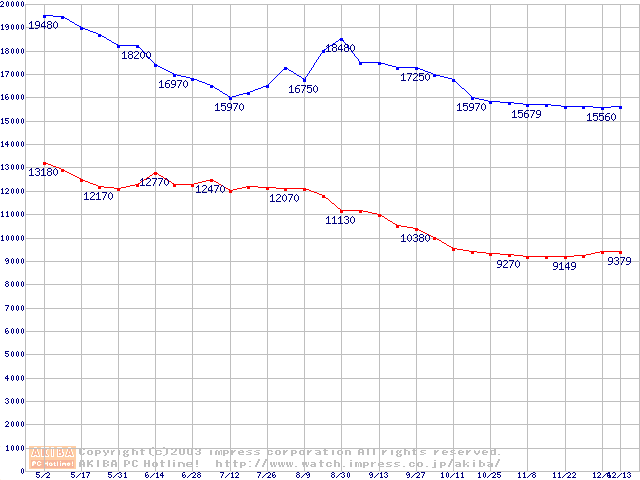 | [↑前グラフ]: | Deskstar 7K250 (7200rpm,UltraATA/100,FDB)の最安値推移 |