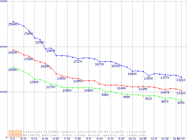| [↑前グラフ]: | Fireball 3 (5400rpm,UltraATA/133,2MB,FDB)の最安値推移 |
