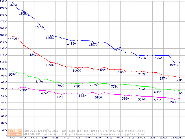 | [↓次グラフ]: | Barracuda 5400.1 (5400rpm,UltraATA/100,2MB,FDB)の最安値推移 |