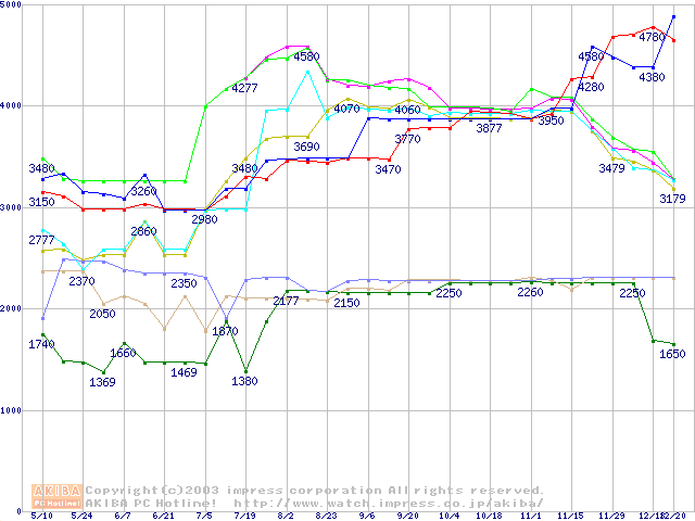 メモリ主要製品(最安値5千円未満)の最安値推移