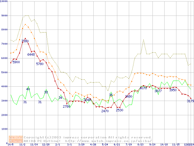 メモリ主要製品(最安値5千円未満)の最安値推移