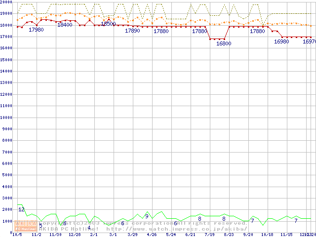 Socket 370 (FC-PGA2,FSB 133MHz,L2 512KB,Tualatin)の最安値推移