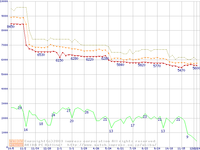 Socket 370 (FC-PGA2,FSB 100MHz,L2 256KB,Tualatin)の最安値推移