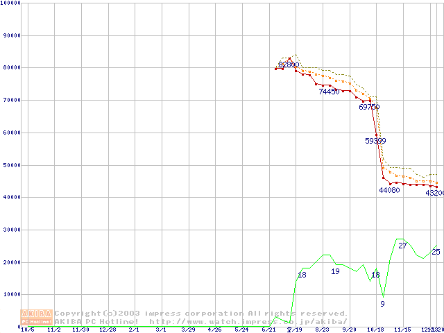 Socket 478 (micro-PGA,FSB 800MHz,L2 512KB,Hyper-Threading,Northwood)の最安値推移