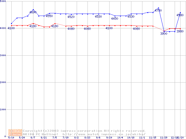 | [↑前グラフ]: | Socket 370 (PGA,FSB 133MHz,L2 64KB,Nehemiah)の最安値推移 |