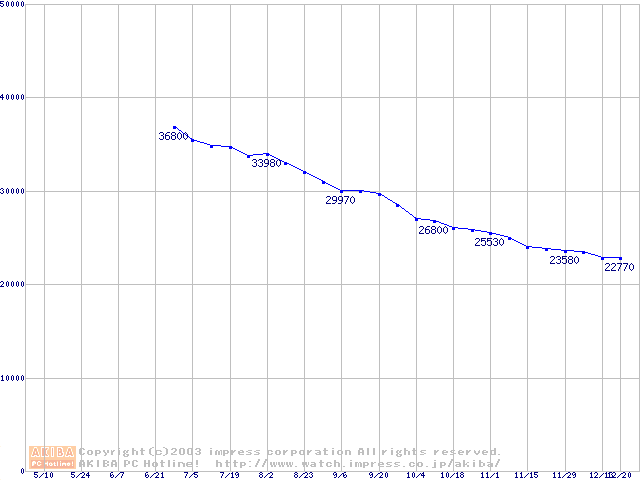 | [↑前グラフ]: | Deskstar 180GXP (7200rpm,2MB,UltraATA/100,FDB)の最安値推移 |