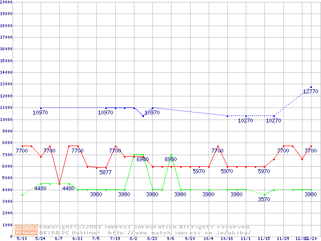 | [↓次グラフ]: | PC133 SDRAM DIMM CasLatency=3 ECC対応 Registeredタイプの最安値推移 |