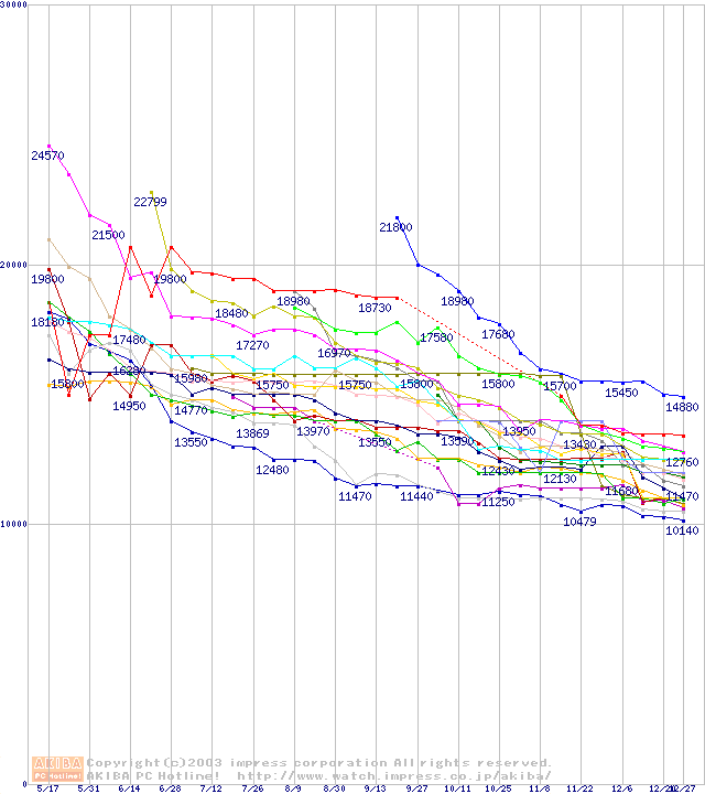 HDD主要製品(最安値1万5千円~2万円未満)の最安値推移