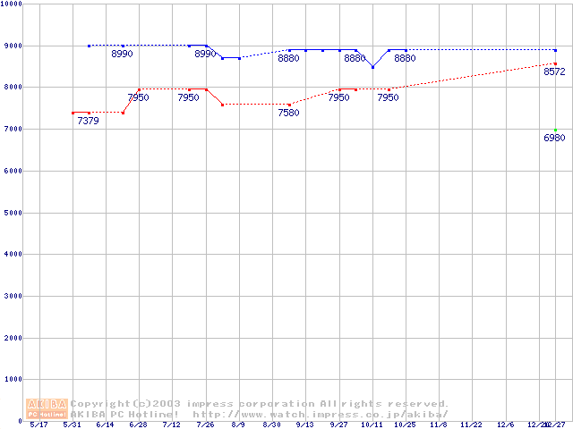 | [↑前グラフ]: | Socket A (OPGA,FSB 266MHz,L2 256KB,Thoroughbred)の最安値推移 |