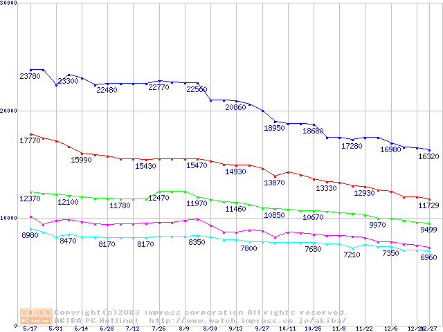 | [↑前グラフ]: | MaXLine Plus II (7200rpm,8MB,UltraATA/133,FDB)の最安値推移 |