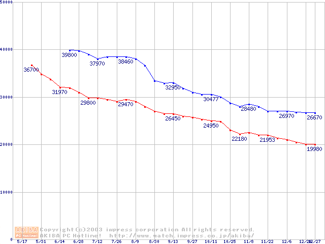 | [↑前グラフ]: | DiamondMax Plus 8 (7200rpm,2MB,UltraATA/133,FDB)の最安値推移 |