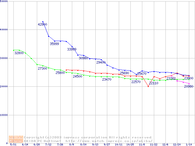| [↓次グラフ]: | 2.5インチHDD 20GB~40GB未満(9.5mm厚)の最安値推移 |