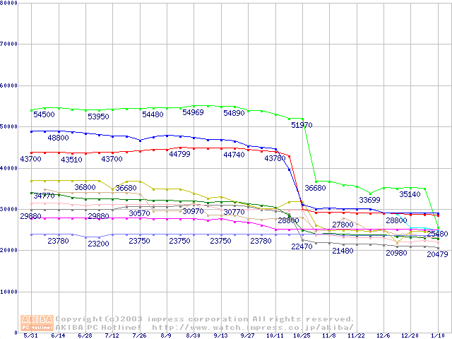 CPU主要製品(最安値2万円~3万円未満)の最安値推移