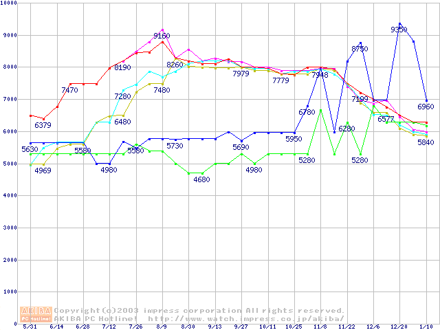 メモリ主要製品(最安値5千円~1万円未満)の最安値推移