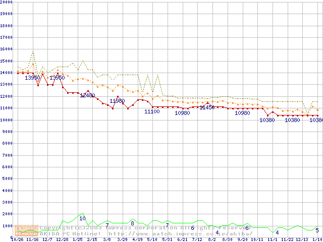 Socket 370 (FC-PGA,FSB 133MHz,L2 256KB,Coppermine)の最安値推移