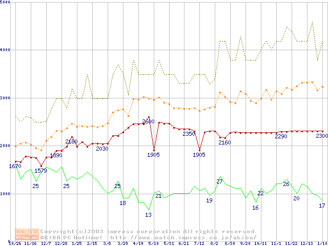 PC100 SDRAM DIMM CasLatency=2の最安値推移