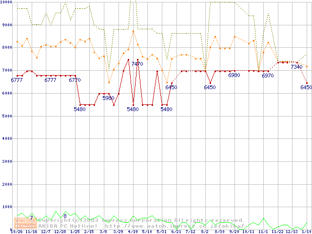 PC133 SDRAM DIMM CasLatency=3 ECC対応 Registeredタイプの最安値推移