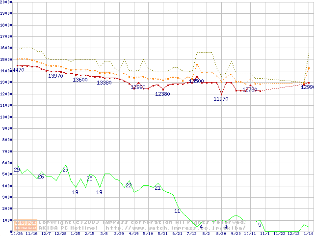 Travelstar 40GN (9.5mm,4200rpm,UltraATA/100,2MB,FDB,20GB/Platter)の最安値推移
