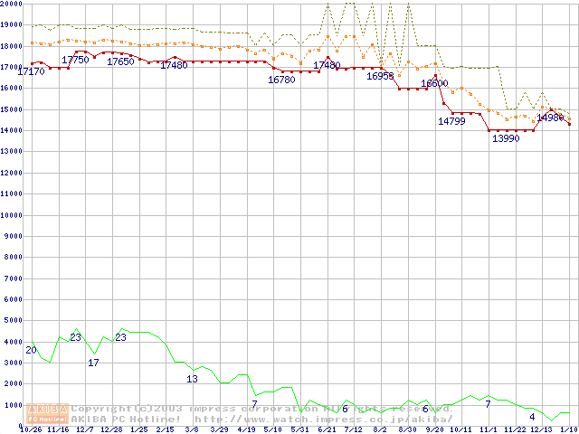 Socket 478 (micro-PGA,FSB 400MHz,L2 512KB,Northwood)の最安値推移