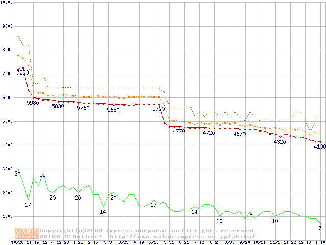 Socket 370 (FC-PGA2,FSB 100MHz,L2 256KB,Tualatin)の最安値推移