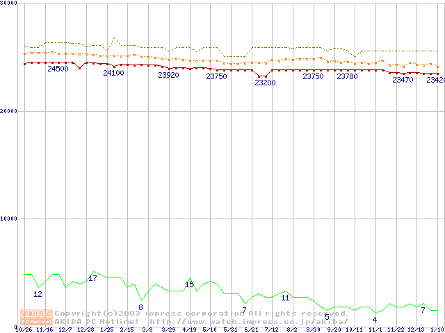 Socket 370 (FC-PGA2,FSB 133MHz,L2 512KB,Tualatin)の最安値推移