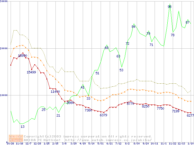 PC3200(DDR400) DDR SDRAM DIMMの最安値推移