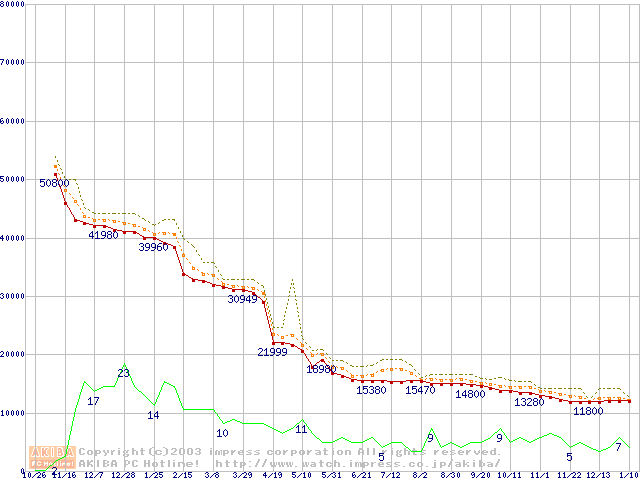 Socket A (OPGA,FSB 333MHz,L2 256KB,Thoroughbred)の最安値推移