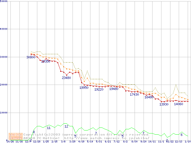 Socket A (OPGA,FSB 266MHz,L2 256KB,Thoroughbred)の最安値推移