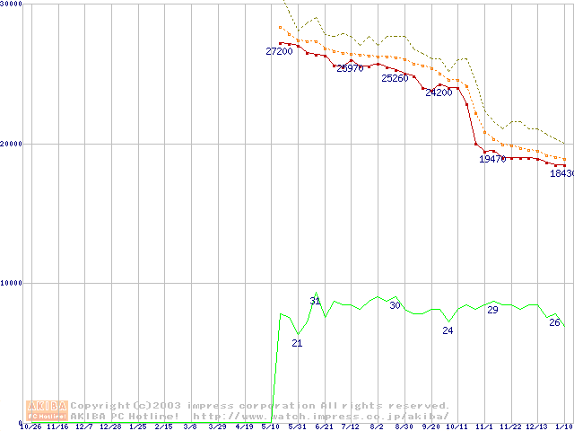 Socket 478 (micro-PGA,FSB 800MHz,L2 512KB,Hyper-Threading,Northwood)の最安値推移