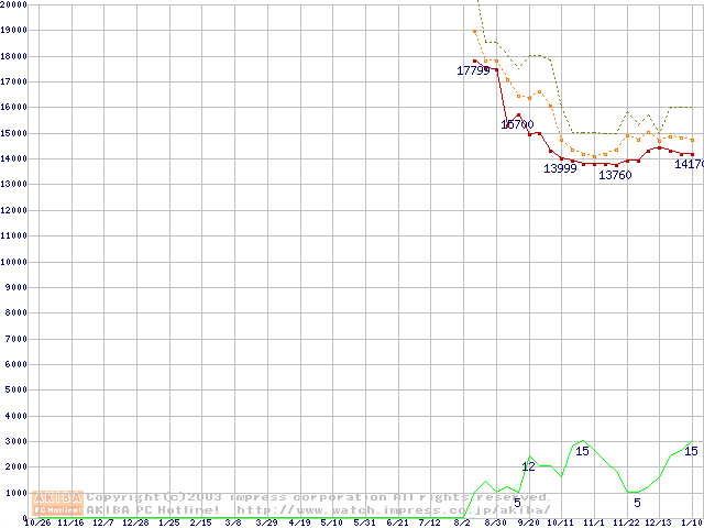 Travelstar 5K80 (9.5mm,5400rpm,UltraATA/100,8MB,FDB,40GB/Platter)の最安値推移