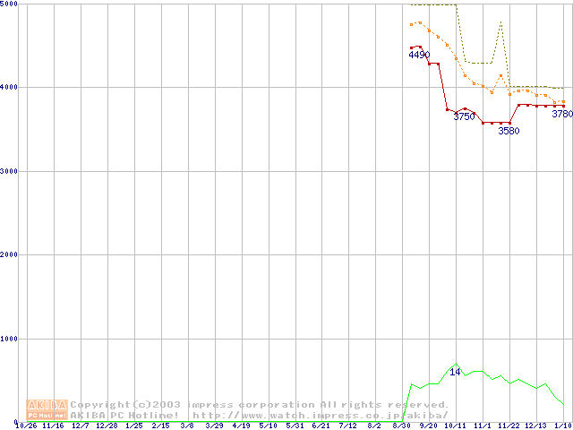 Socket A (OPGA,FSB 266MHz,L2 64KB,Applebred)の最安値推移