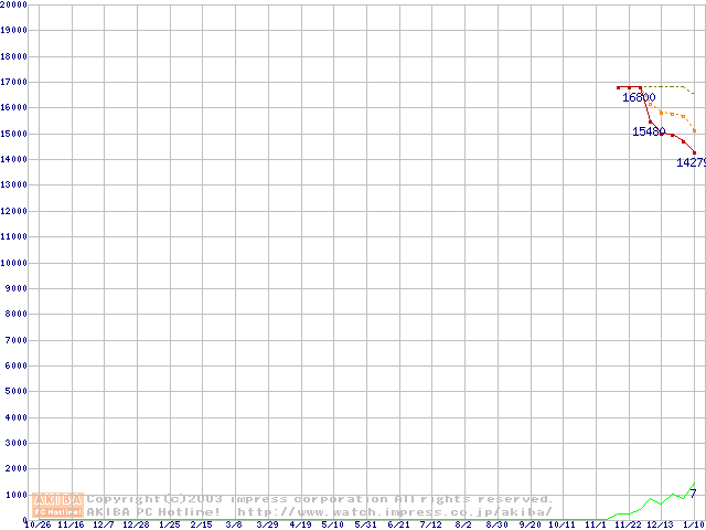 2.5インチHDD主要製品(最安値1万円~1万5千円未満)の最安値推移