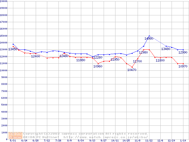 | [↑前グラフ]: | Travelstar 80GN (9.5mm,4200rpm,UltraATA/100,8MB,FDB,40GB/Platter)の最安値推移 |