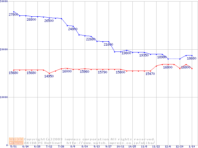 | [↑前グラフ]: | MKシリーズ (9.5mm,7200rpm,16MB,FDB)の最安値推移 |
