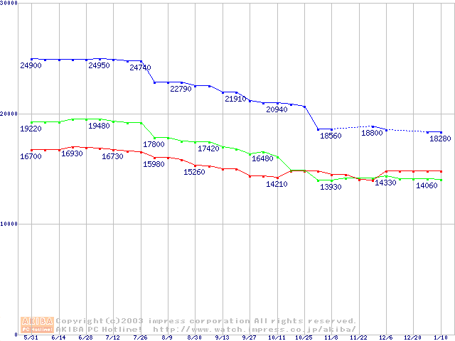 | [↓次グラフ]: | Socket A (PGA,FSB 266MHz,L2 256KB,Thunderbird)の最安値推移 |