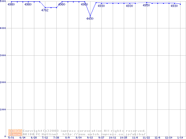 | Socket A (PGA,FSB 266MHz,L2 256KB,Thunderbird)の最安値推移 |
