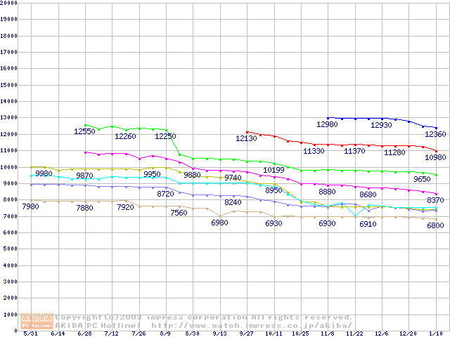 | [↓次グラフ]: | Socket 478 (micro-PGA,FSB 400MHz,L2 128KB,Willamette)の最安値推移 |