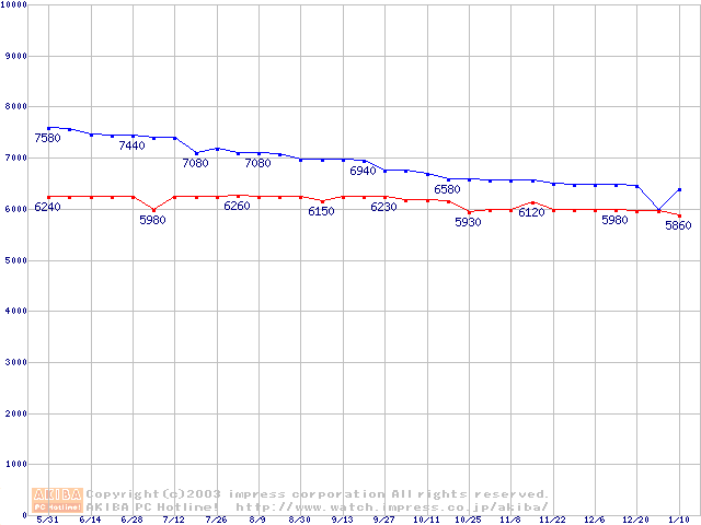 | [↓次グラフ]: | Socket 370 (FC-PGA2,FSB 133MHz,L2 512KB,Tualatin)の最安値推移 |