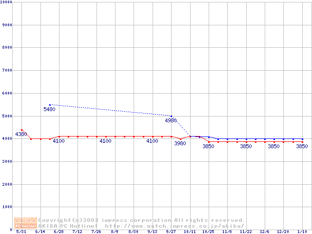| [↑前グラフ]: | Socket 370 (FC-PGA2,FSB 100MHz,L2 256KB,Tualatin)の最安値推移 |