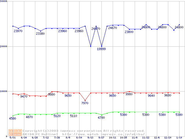 | [↓次グラフ]: | PC800-40 DRDRAM RIMM ECC対応の最安値推移 |