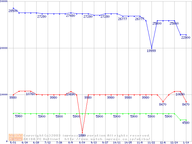 | [↓次グラフ]: | PC1066 DRDRAM RIMM4200(32bit)の最安値推移 |