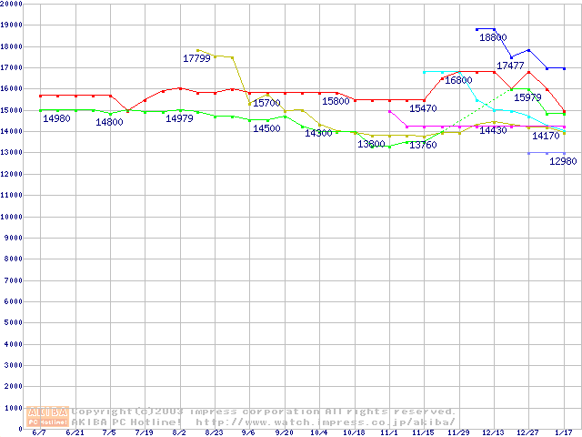 | [↑前グラフ]: | 2.5インチHDD 40GB~50GB未満(9.5mm厚,4200rpm)の最安値推移 |