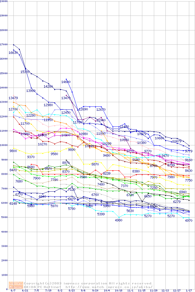 HDD主要製品(最安値1万円~1万5千円未満)の最安値推移