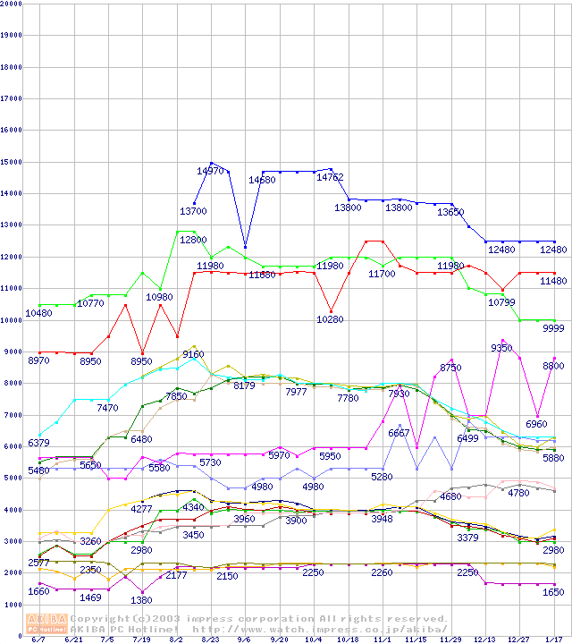 メモリ主要製品の最安値推移