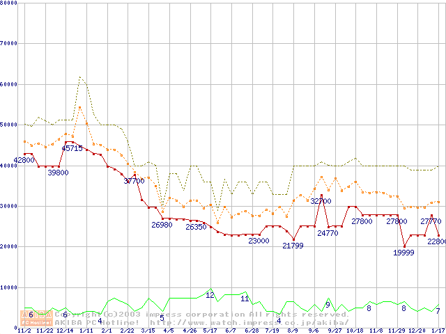 PC2100(DDR266) DDR SDRAM DIMM ECC対応 Registeredタイプの最安値推移