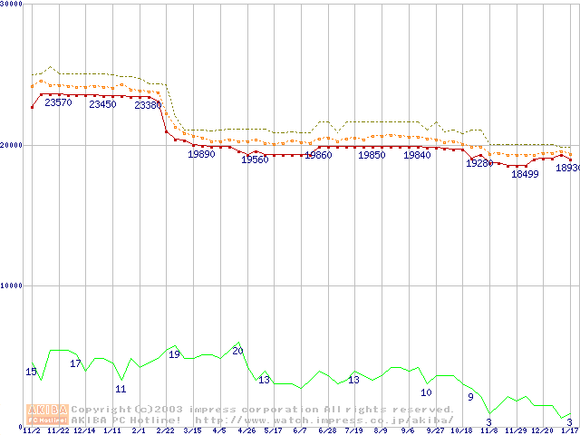Socket 478 (micro-PGA,FSB 400MHz,L2 512KB,Northwood)の最安値推移