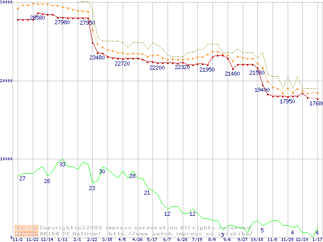 Socket 478 (micro-PGA,FSB 533MHz,L2 512KB,Northwood)の最安値推移