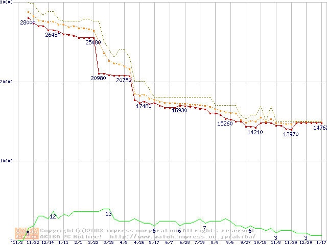 Socket A (OPGA,FSB 266MHz,L2 256KB,Thoroughbred)の最安値推移