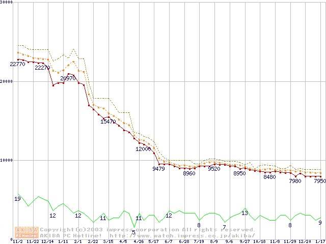 Socket A (OPGA,FSB 266MHz,L2 256KB,Thoroughbred)の最安値推移
