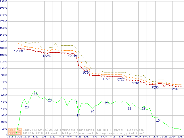 Socket 478 (micro-PGA,FSB 400MHz,L2 128KB,Northwood)の最安値推移